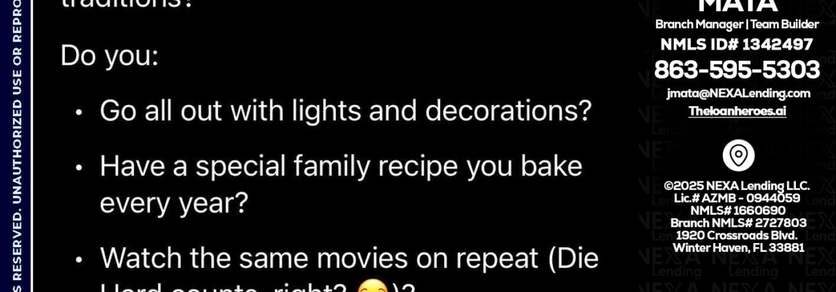 I love christmas - Joe Mata -Branch Manager | Team BuilderHi, my name is Joe Mata. I’m a Loan Officer with NEXA Lending LLC., offering personalized mortgage solutions, fast customized quotes, great rates and service with integrity.