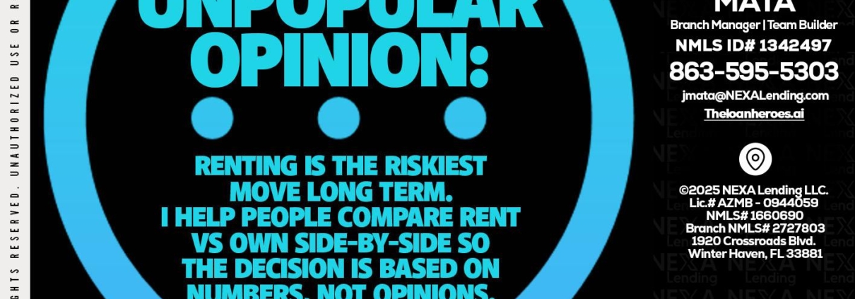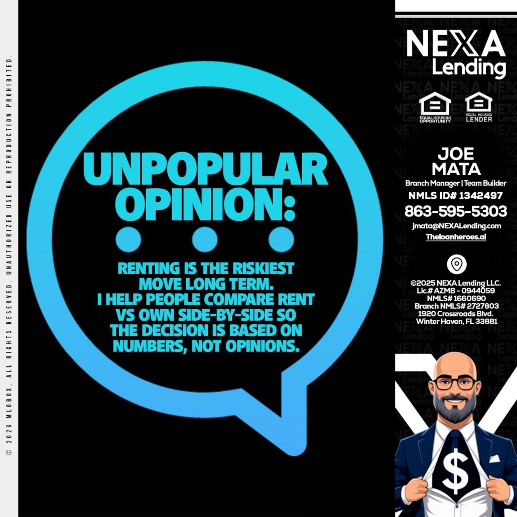 unpopular opinion - Joe Mata -Branch Manager | Team BuilderHi, my name is Joe Mata. I’m a Loan Officer with NEXA Lending LLC., offering personalized mortgage solutions, fast customized quotes, great rates and service with integrity.